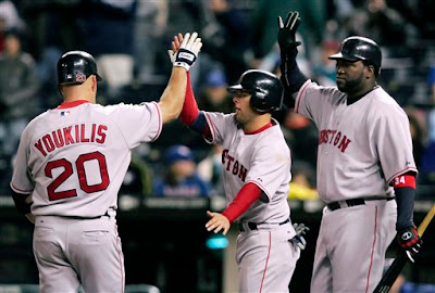 and bats. oh, the glorious bats. run-scoring double for JD Drew (who is at least making it a *tiny* bit easier to see him sporting #7, at least for as long as he keeps producing). the King of Doubles is back to hitting a double a game, this time sending two runners across the plate. the illustrious Captain is wielding a bat again, getting on base or at the very least sac-flying in a run. and Youk is continuing is his own personal Home Run Derby that he started in Spring Training.